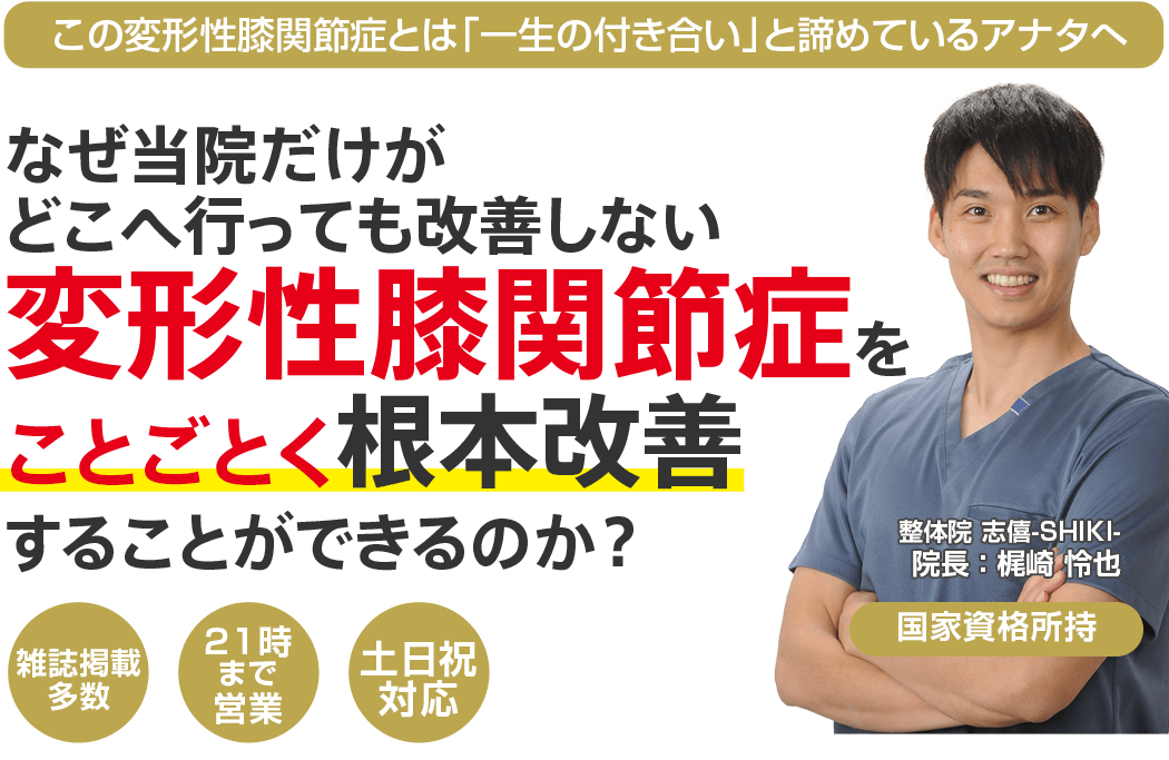 国家資格を持ち、12年以上の臨床経験からあなたの症状に正面から向き合ってくれる四国中央市で唯一の「変形性膝関節症専門」整体院志僖-SHIKI-に来院し、もう二度と痛みで悩むことなく、健康で楽しい毎日を送る道。