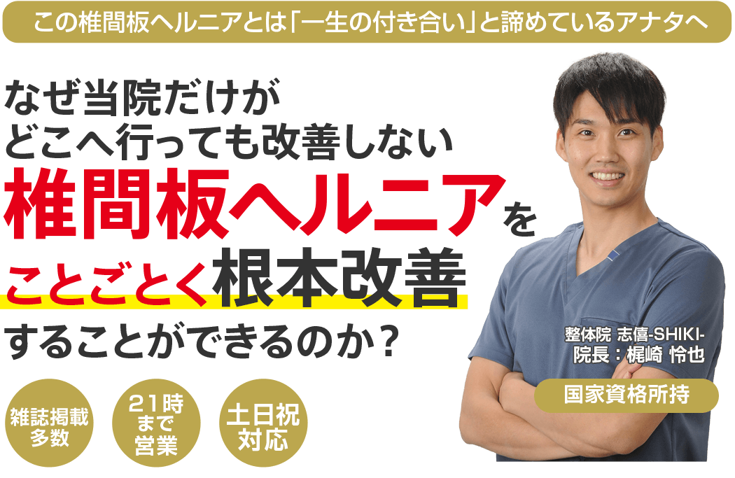 国家資格を持ち、12年以上の臨床経験からあなたの症状に正面から向き合ってくれる四国中央市で唯一の「椎間板ヘルニア専門」整体院志僖-SHIKI-に来院し、もう二度と痛みで悩むことなく、健康で楽しい毎日を送る道。