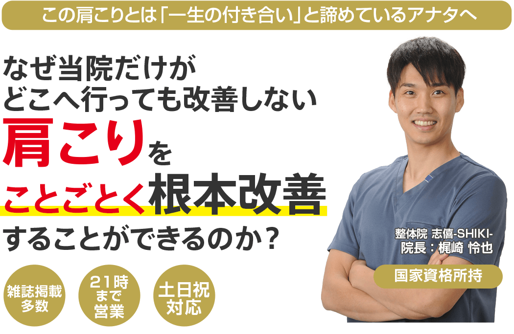 国家資格を持ち、12年以上の臨床経験からあなたの症状に正面から向き合ってくれる四国中央市で唯一の「肩こり専門」整体院志僖-SHIKI-に来院し、もう二度と痛みで悩むことなく、健康で楽しい毎日を送る道。