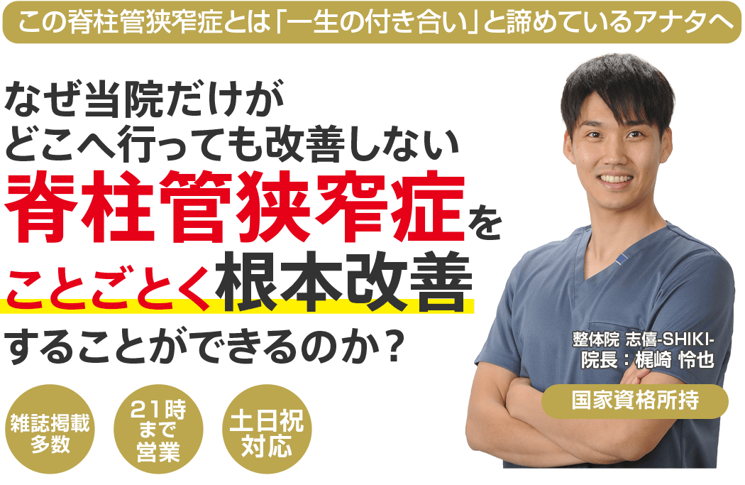国家資格を持ち、12年以上の臨床経験からあなたの症状に正面から向き合ってくれる四国中央市で唯一の「脊柱管狭窄症専門」整体院志僖-SHIKI-に来院し、もう二度と痛みで悩むことなく、健康で楽しい毎日を送る道。